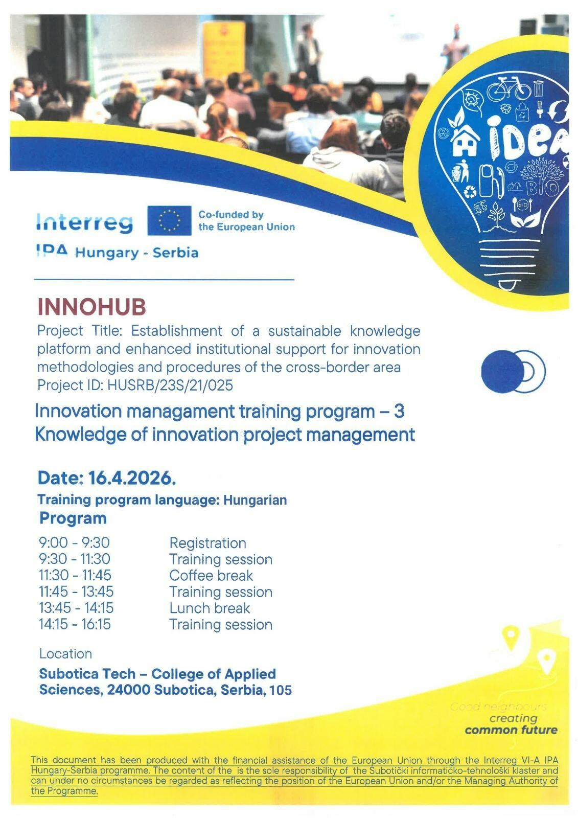 A Szabadkai Műszaki Szakfőiskolán az INNOHUB projekt keretében képzés kerül megrendezésre, amely az innovációs projektmenedzsmenthez kapcsolódó ismeretek fejlesztésére irányul.