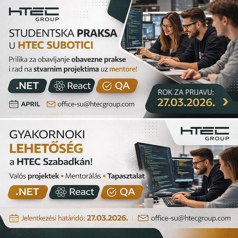 Pozivamo zainteresovane studente druge i treće godine studija da se prijave na konkurs za jednomesečnu stručnu praksu u HTEC kancelariji u Subotici.